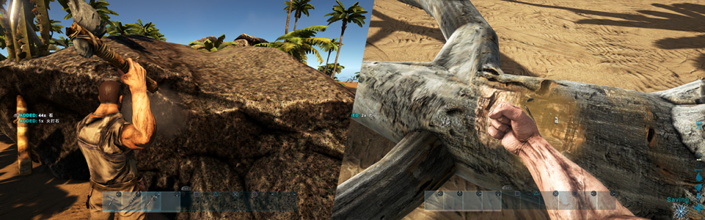 素手で実を採取して、斧で木を伐採して、ピッケルで石を採掘して、武器や防具・拠点を作って冒険ができます!