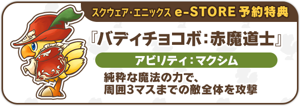 スクウェア・エニックスでは『バディチョコボ:赤魔導士』が手に入る。周囲3マスまでの敵全体を攻撃は強力ですね。さすが発売元なだけあります。