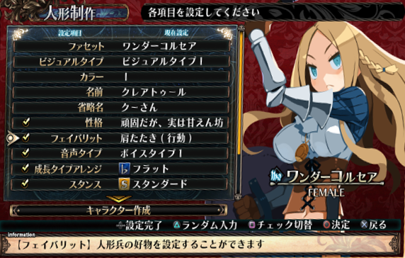 人形兵は、自分の好きなように性格や容姿、名前さらには成長タイプやカラータイプ、好みのスキル、フレーバーテキストまで、様々な項目が任意で設定できる。