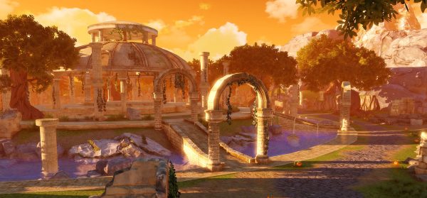 夕焼けの空、遺跡のようなものがあり、辺りには採取のできそうな木の実や花が育っている。